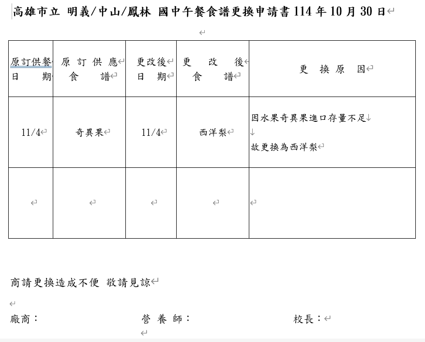 114年11月04日菜單更換(奇異果→西洋梨)